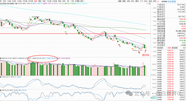 创业板开低收高,但是收盘没有过昨日实体二分之一,为颈内线,提防反弹再下杀