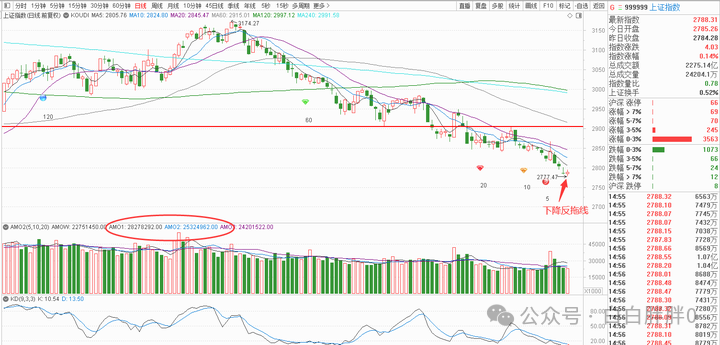 K线角度,上证指数高开于昨日阴线实体范围内,收盘于昨日阴线实体之上,为下降反拖线,宜提防空方再度攻击。