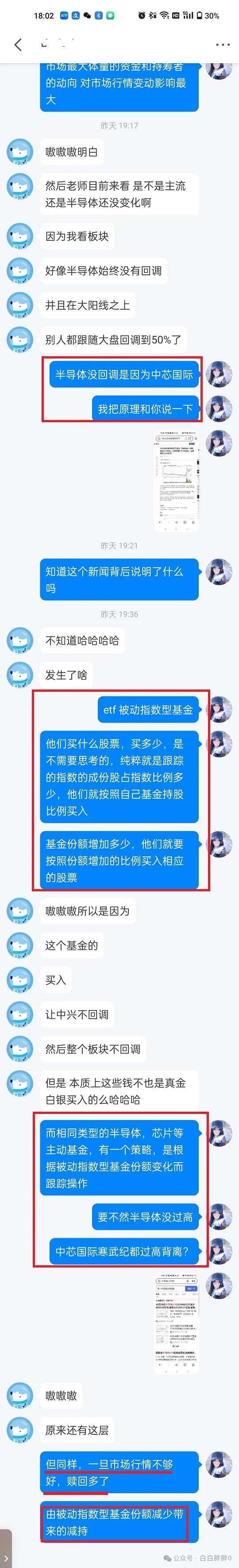 昨天市场跌,半导体没跌是因为前天这些被动指数基金的份额增加,对于这些被动型基金的操作,假设份额增加10%,要维持持股比例不变,就会去机械式加仓所有股票这个比例,所以9月下旬科创50,半导体指数那么疯狂上涨对应当时的被动基金份额增加程度是不是就理解了?为什么中芯,寒武纪涨的最好?