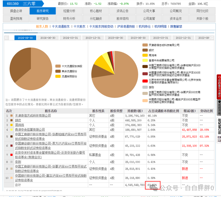 从上图可以知道,360的前十大股东,占有公司的流通股本比例是63.62%