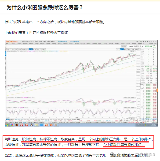 纳斯达克,股价过高,指标不过高,数度背离,呈现一个向上的倾斜三角形,是一个上升楔形,这些特征,都是第五浪末升段的特征,一旦跌破上升楔形下沿,会快速跌回第五浪起涨点。