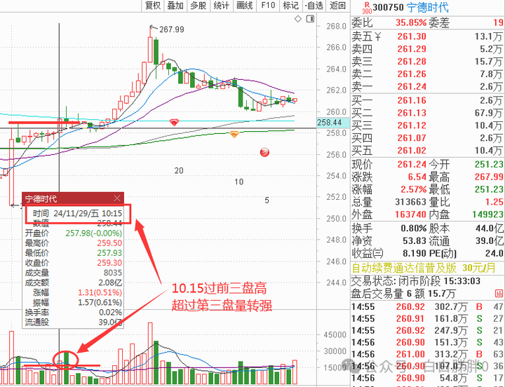 宁德今天10.15过前三盘高超过第三盘量转强