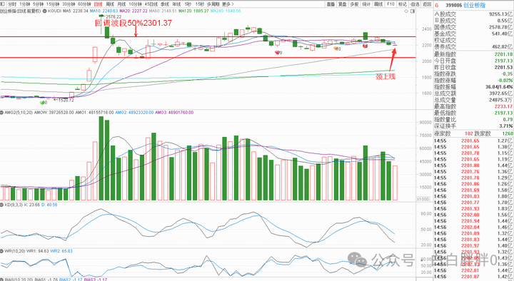 当然,创业板指数最后没能收中长阳的原因是几只权重的弱势