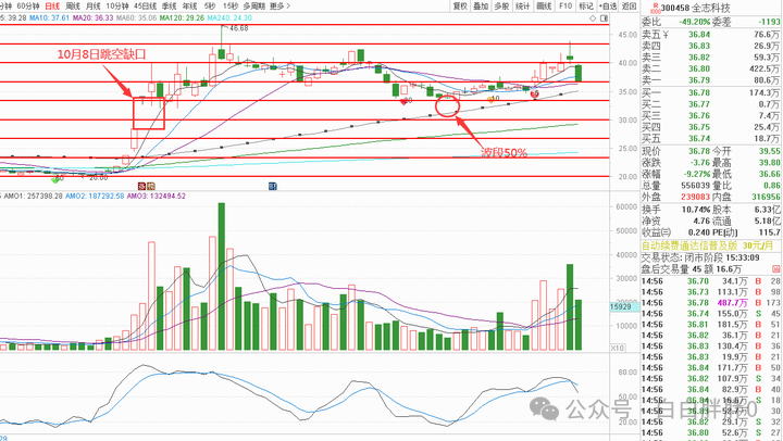 然后全志科技,现在事后看图说故事要找一个近段时间的合理试错点是11月25日和27日跌到波段比例50%叠加10月8日有效缺口的支撑位置的买点