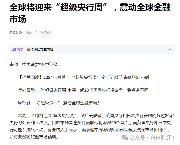 所以关注点不是这个,而是会议后美联储对来年降息速度幅度的鹰或者鸽的发言,这个和川皇的动作将会决定未来的一年,“全世界”金融市场的底层逻辑的形成(美元是世界贸易第一大货币,相关变动会直接影响相关贸易国,债务国的经济层面的方方面面,所以全世界的央行基本都会对应美联储的发言做出“应对”措施)