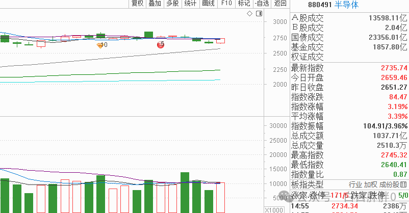 结构方面,昨天说整理当中的半导体今天涨幅第一,具体说的个股全志今天涨幅也接近10%,盘中虽然跌破月线,但并未到达季线