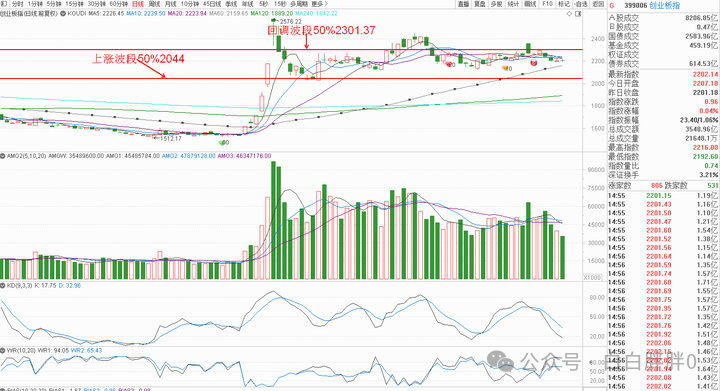 创业板收盘整中的十字星,无明确多空意义,后续需要观察的,就是在周一中阴线之后,反弹始终无法收盘过中阴线实体一半,提防出现下降三法