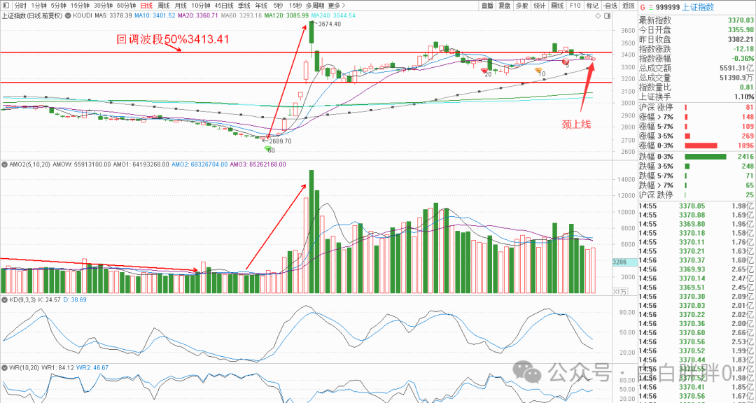 比如今天上证低于上涨趋势基准量,五日线还下弯是压力,颈上线