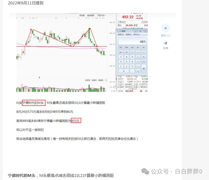里头例举了我2022年9月11日复盘提到的宁德时代M头,会至少跌到403元(前复权价格)
