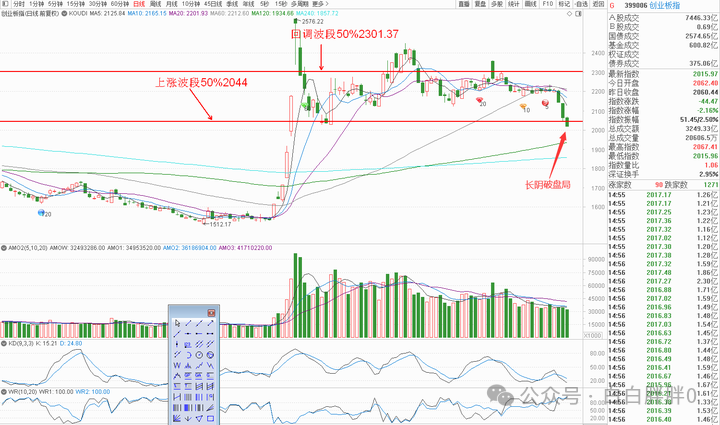 今天创业板既然长阴跌破2026.52,自然是跌破了这一整段时间的盘整平台,为长阴破盘局,偏空解读,加上跌破之前上涨波段的50%2044收盘,那么代表这段上涨趋势发生改变