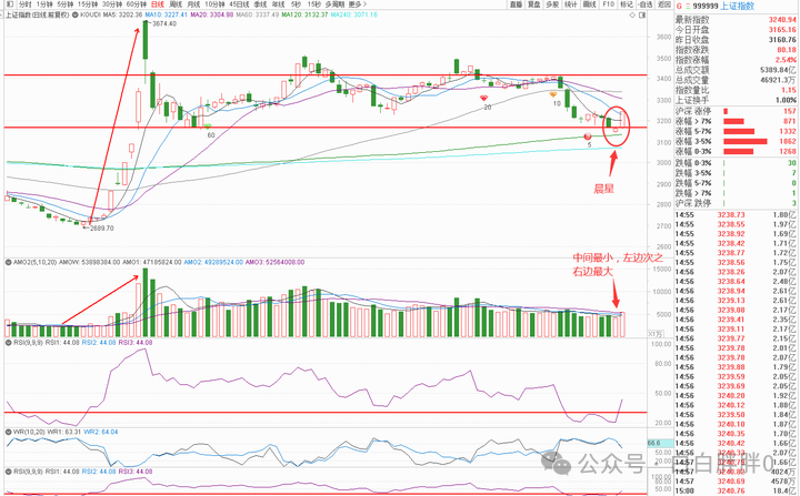 K线角度,上证上周五中长阴线,昨天向下跳空收星线,今天向上跳空封闭之前向下跳空缺口,三天成交金额分布中间最小,左边次之,右边最大,如同昨天复盘所说