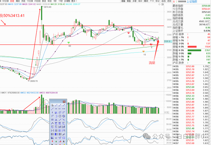 K线角度,上证创短线新高,上影线超实体两倍以上,为流星,偏空解读