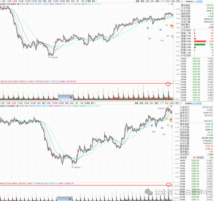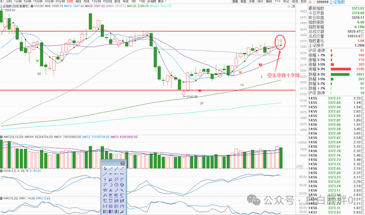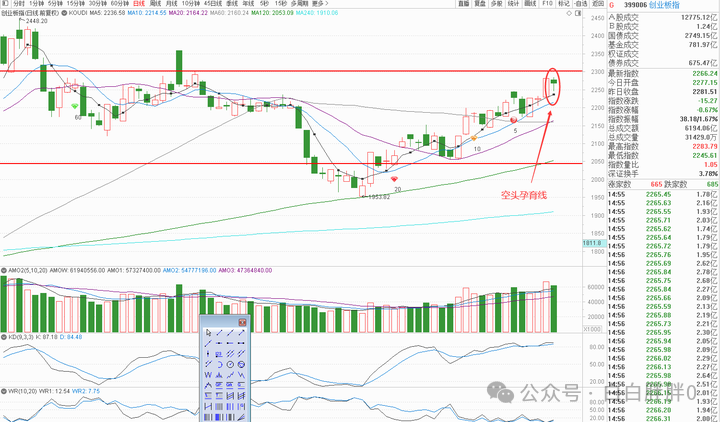 K线角度,上证小周期的空头孕育十字线,创业板小周期的空头孕育线,短线偏空解读