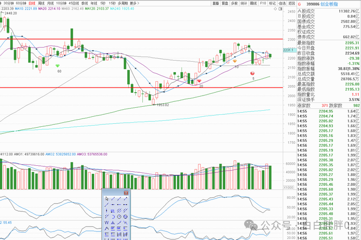 成交金额角度,两个指数较昨日缩量,低于上涨趋势基准量,所以创业板今天被扣高位大量的十日线压制
