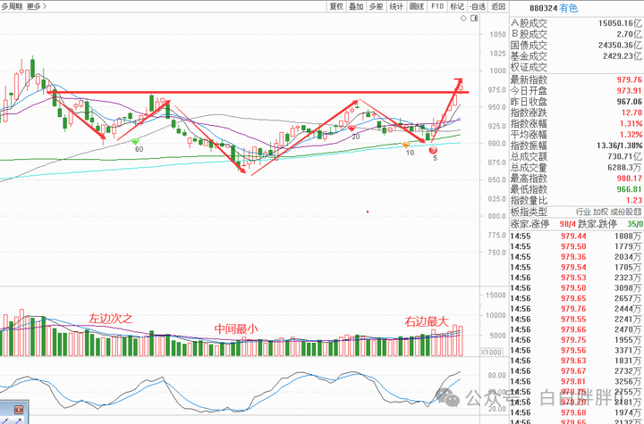 然后我们照着这篇文章对W底的描述条件,来一一对应现在的有色板块