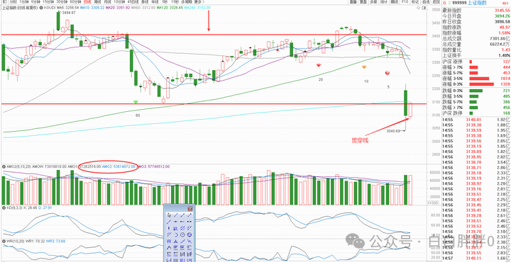 K线角度,上证昨天跌到波段新低,今天开低收高收盘越过昨日K线实体二分之一,为贯穿线,偏多解读