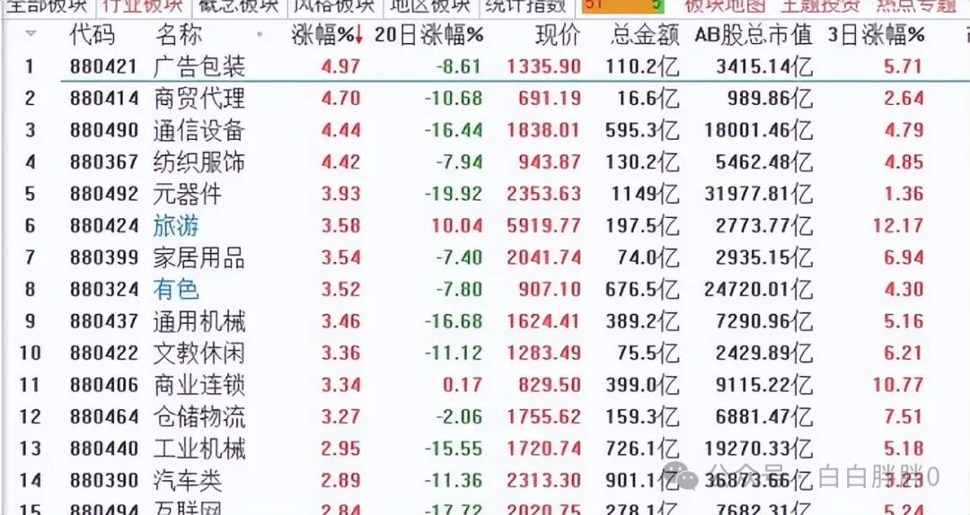 昨天领涨的这些板块,今天除了商贸代理这个不到1000亿市值的族群