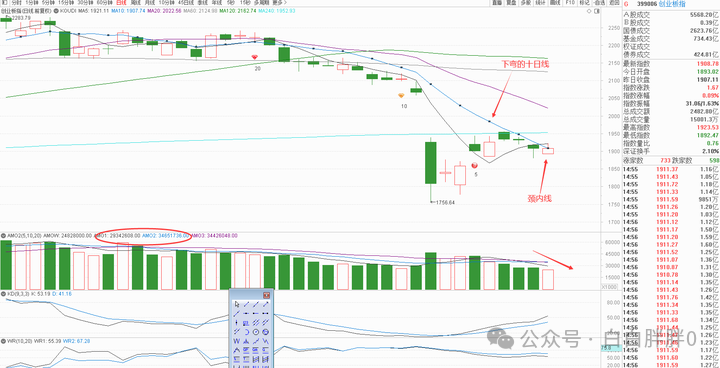 创业板同样开低收高,但是收盘未过昨日K线实体一半,为颈内线