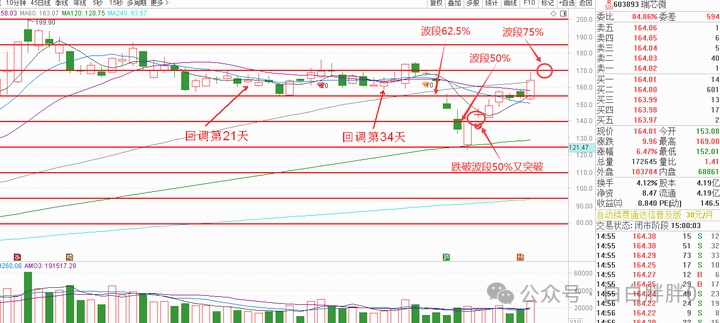 然后跌破波段50%,隔日半年线获得支撑开始反弹,然后突破波段50%,今天反弹接近75%