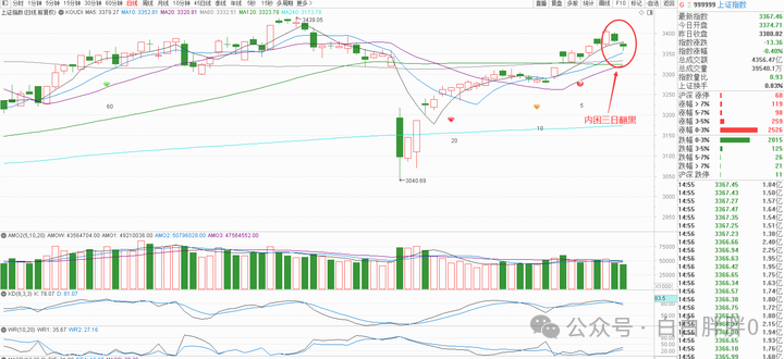 K线角度,今天上证收跌,所以昨日空头孕育线到今天是内困三日翻黑,偏空解读