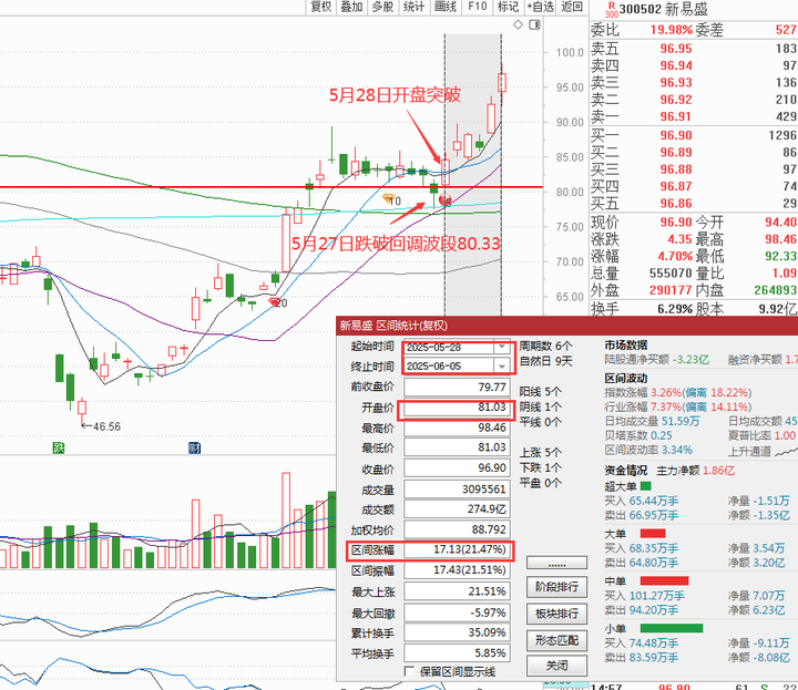 同时进出都有依据,比如上边新易盛突破回调波段一半