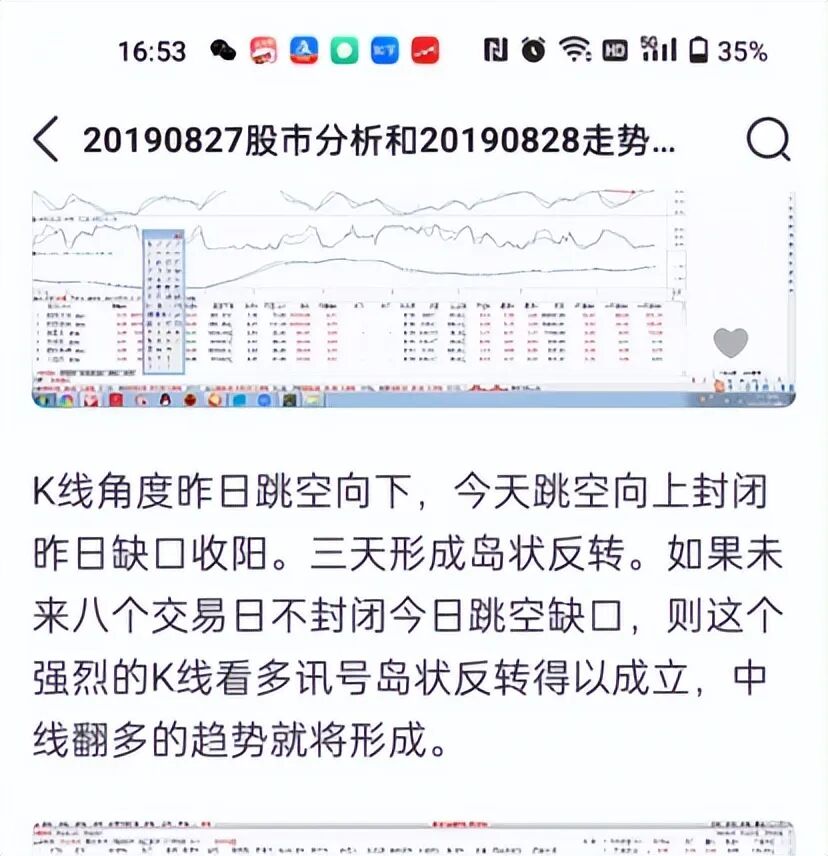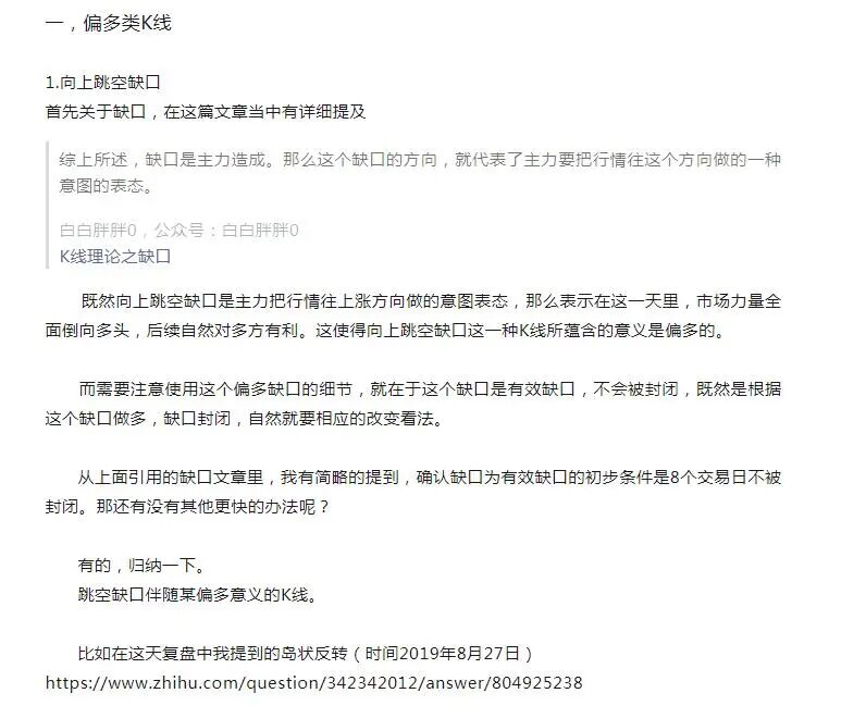 既然向上跳空缺口是主力把行情往上涨方向做的意图表态,那么表示在这一天里,市场力量全面倒向多头,后续自然对多方有利。这使得向上跳空缺口这一种K线所蕴含的意义是偏多的。 而需要注意使用这个偏多缺口的细节,就在于这个缺口是有效缺口,不会被封闭,既然是根据这个缺口做多,缺口封闭,自然就要相应的改变看法。 从上面引用的缺口文章里,我有简略的提到,确认缺口为有效缺口的初步条件是8个交易日不被封闭。那还有没有其他更快的办法呢? 有的,归纳一下。 跳空缺口伴随某偏多意义的K线。 比如在这天复盘中我提到的岛状反转(时间2019年8月27日)