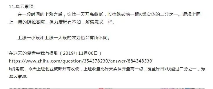 11.乌云罩顶 在一段时间的上涨之后,突然一天开高收低,收盘跌破前一根K线实体的二分之一。逻辑上同上一篇的阴线吞噬,但力度稍有不如,解读意义一样。