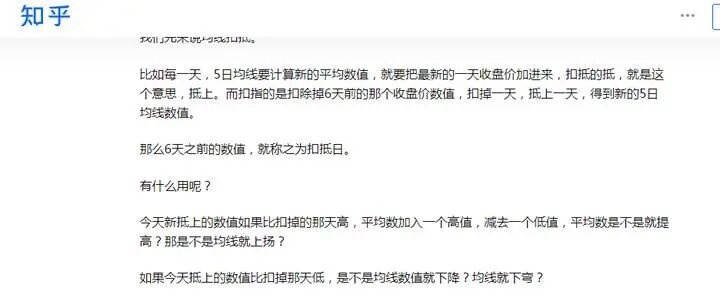 比如每一天,5日均线要计算新的平均数值,就要把最新的一天收盘价加进来,扣抵的抵,就是这个意思,抵上。而扣指的是扣除掉6天前的那个收盘价数值,扣掉一天,抵上一天,得到新的5日均线数值。 那么6天之前的数值,就称之为扣抵日。 有什么用呢? 今天新抵上的数值如果比扣掉的那天高,平均数加入一个高值,减去一个低值,平均数是不是就提高?那是不是均线就上扬? 如果今天抵上的数值比扣掉那天低,是不是均线数值就下降?均线就下弯?