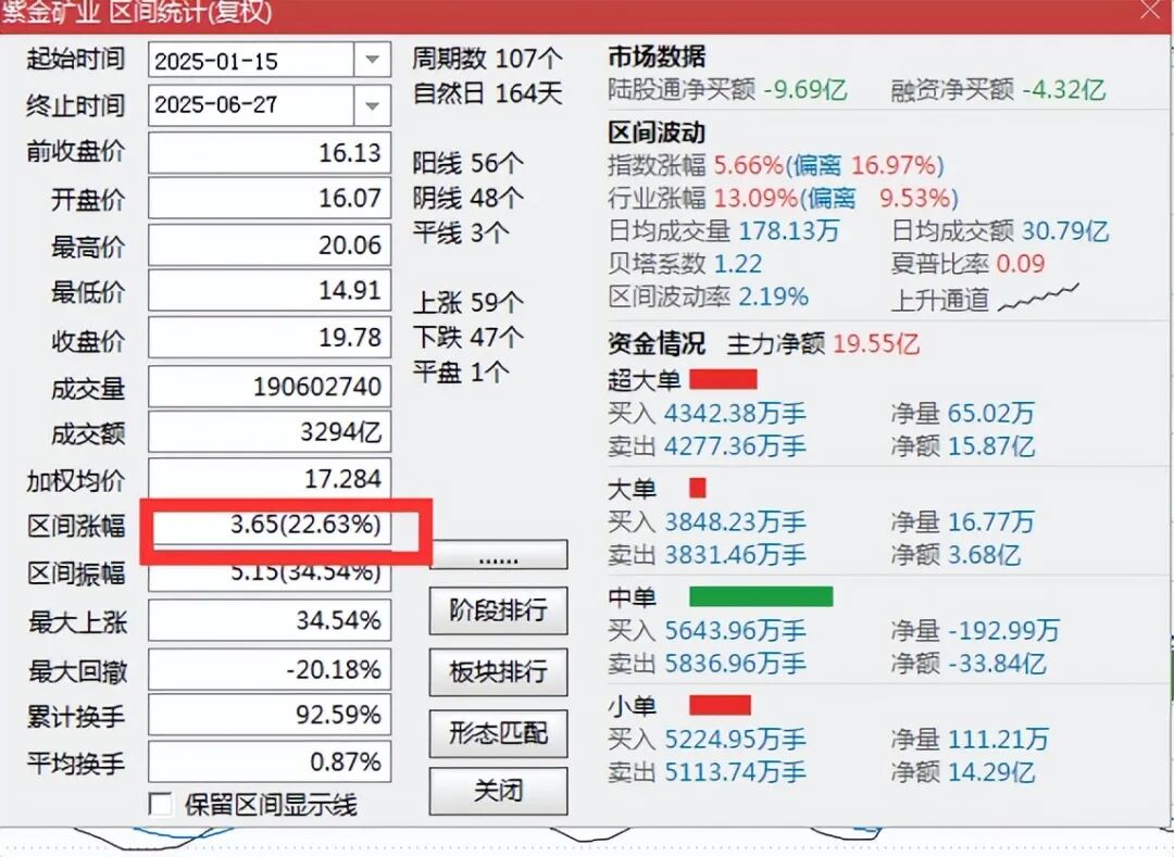 今天紫金矿业越过19.87(中间除权过一次,复权价格是去年10月8日的19.59)
