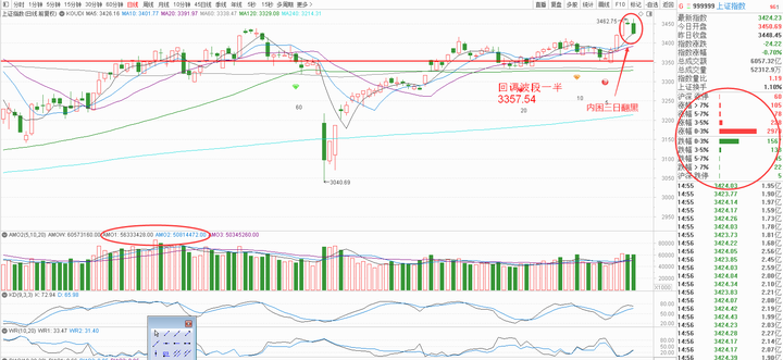K线角度,上证收阴,在昨日小周期的空头孕育线后,今天收阴,三天为内困三日翻黑,偏空解读