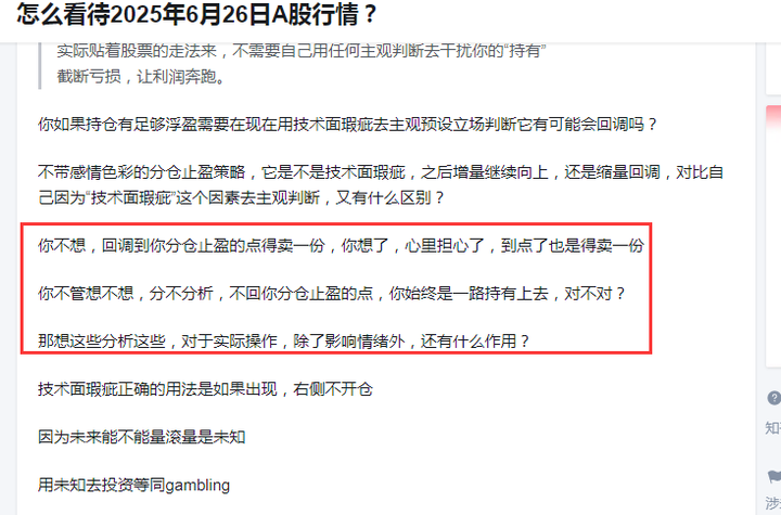你不想,回调到你分仓止盈的点得卖一份,你想了,心里担心了,到点了也是得卖一份