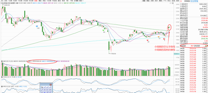 创业板单日收小周期的高档纺锤线,和昨日K线构成小周期的空头孕育线,偏空解读,但是要留意,整理始终收盘不跌破6月25日阳线实体一半,有机会走上升三法
