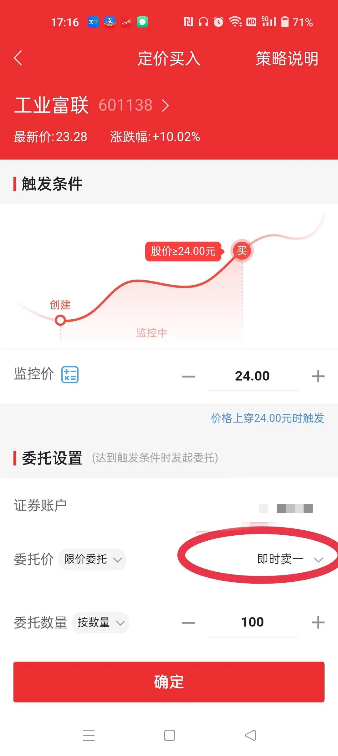 只要盘中上穿了你所设定的那个价格,app会瞬时以当时即时卖一的价格挂单