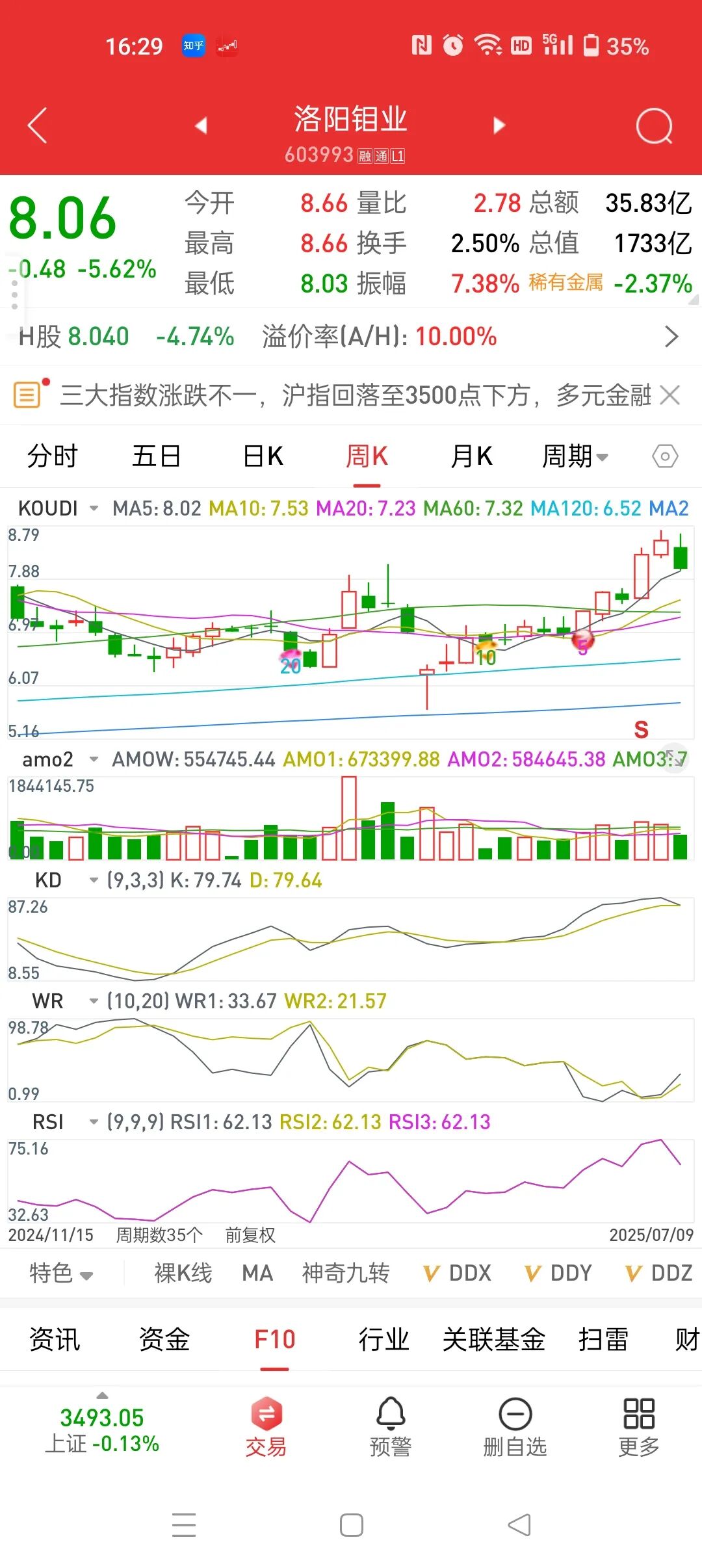 今天下跌爆大量,固然是有人卖,但同样有人买,月线还扣低位低量(这点紫金不同),某技术指标统计学因素接近超卖极限值,以洛阳这种国家队外资法人机构为主力类型的大盘权重股的历史统计而言,超七成概率达到或者超出短线就会开始修复这个极限值(盘整现价被动接近九周期最高扣抵价或者上涨现价主动接近九周期最高扣抵价)