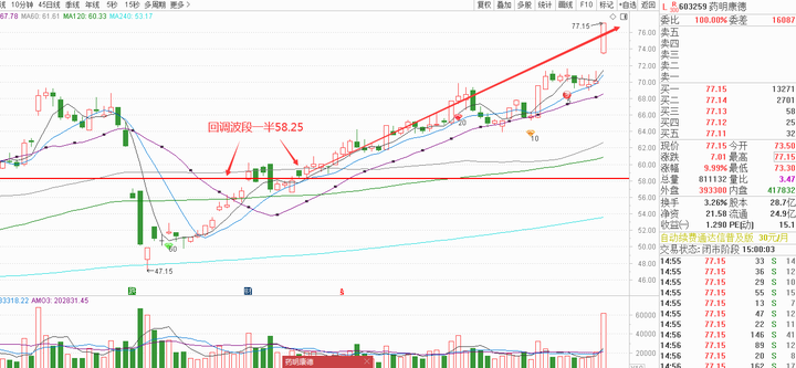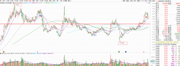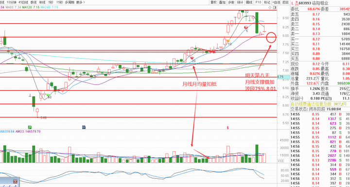手机看盘时间周期一长就是不方便,昨天提到洛阳钼业回调波段的一半计算,低点的选择错误了