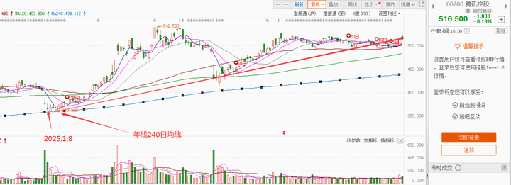 今年1月8日提到腾讯的年线(240日均线)是 支撑