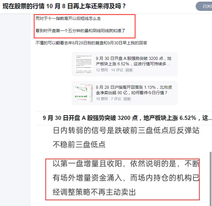而对于十一指数高开以后短线怎么走 看到时开盘第一个五分钟的量和阴线阳线就知道了 不懂的可以翻看去年8月28日我的复盘和9月30日早上我的回答