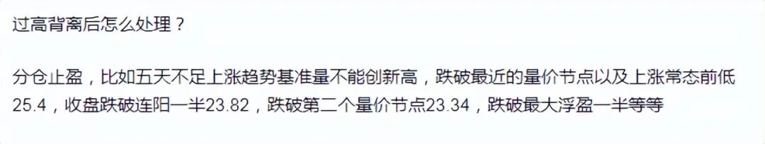 分仓止盈,比如五天不足上涨趋势基准量不能创新高,跌破最近的量价节点以及上涨常态前低25.4,收盘跌破连阳一半23.82,跌破第二个量价节点23.34,跌破最大浮盈一半等等
