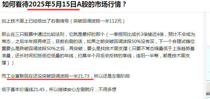 5月15日复盘提到,工业富联回调波段一半的突破价格21.73