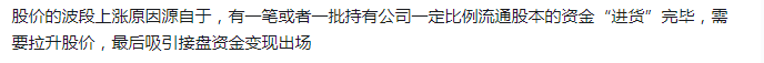 股价的波段上涨原因源自于,有一笔或者一批持有公司一定比例流通股本的资金“进货”完毕,需要拉升股价,最后吸引接盘资金变现出场