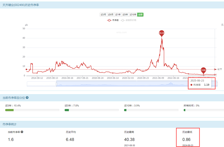 天齐锂业市净率1.2上下,而历史最低是0.86