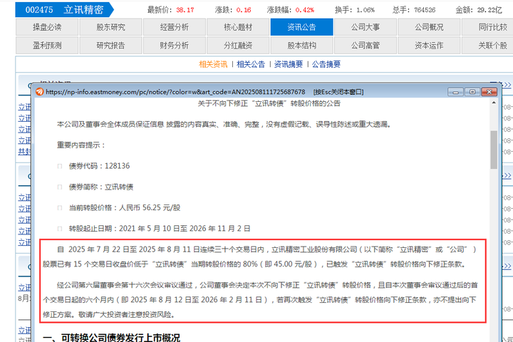 但是立讯董事会却“拒绝下修”