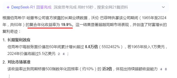 伯克希尔哈撒韦的复合年化收益率也仅有不到20%