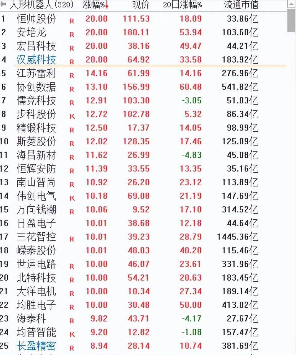而所有的跟人形机器人概念相关涨的多的个股