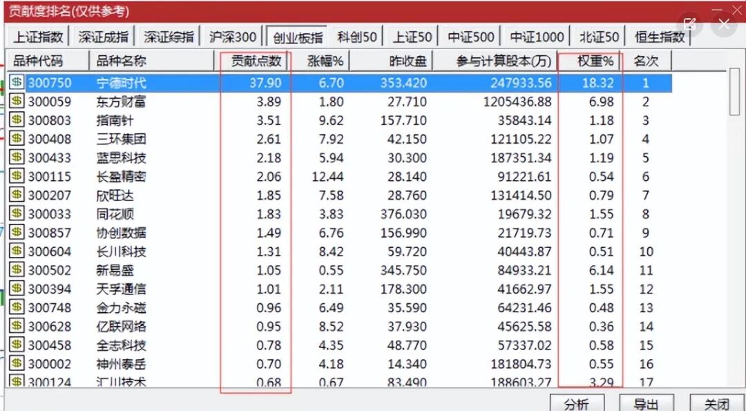 创业板今天涨60点,宁德一家37,12家股票就有超过60点,创业板一共1370只股票,增量和上涨的都是这少部分权重