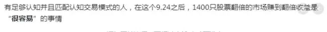 有足够认知并且匹配认知交易模式的人,在这个9.24之后,1400只股票翻倍的市场赚到翻倍收益是“ 很容易 ”的事情