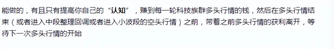 能做的,有且只有提高你自己的“ 认知 ”,赚到每一轮科技族群多头行情的钱,然后在多头行情结束(或者进入中段整理回调或者进入小波段的空头行情)之前,带着之前多头行情的获利离开,等待下一次多头行情的开始