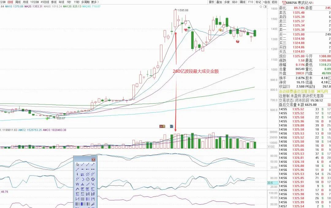 股价1595.88当日是7月新的上涨波段出现以后得波段最大量(后续出更大量不影响判断)