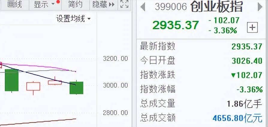 缩量的创业板有可能被“ 下弯的 ”五日线“ 压制 ”形成 下降三法 。