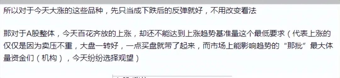 那对于A股整体,今天百花齐放的上涨,却还不能达到上涨趋势基准量这个最低要求(代表上涨的仅仅是因为卖压不重,大盘一转好,一点买盘就带了起来,而市场上能影响趋势的“那批”最大体量资金们(机构),今天纷纷选择观望)